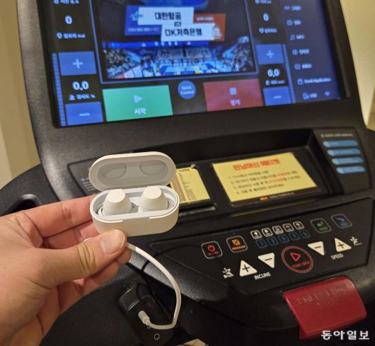 헬스장 러닝머신(트레드밀)의 외부입력(AUX) 단자에 LG 엑스붐 버즈플러스의 전용 플러그를 꽂아 충전 케이스와 연결하자, 귀에 착용한 무선 이어폰으로 트레드밀 TV 화면의 소리가 그대로 흘러나왔다.