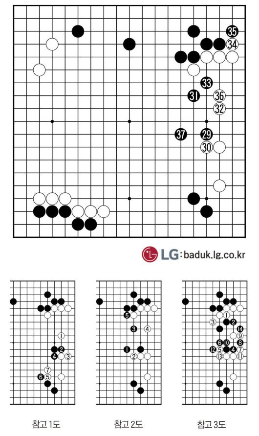 31은 참고 2도가 보통. 신민준은 33으로 들여다보았을 때 34, 36으로 간명하게 변신했다. 참고 3도 1로 잇는 것은 14까지 흑이 성공적. 백은 여전히 미생인 것이 부담스럽다. 37까지 쌍방 이렇다 할 충돌 없는 탐색전이 이어졌다.