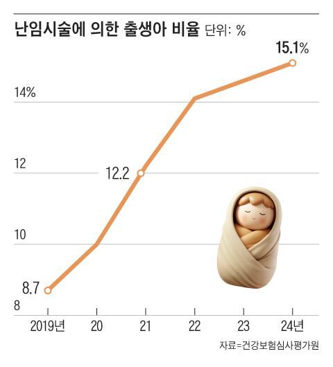 14일 건강보험심사평가원의 ‘난임 시술 부작용 분석 및 관리 방안 마련 연구’에 따르면, 2024년 전체 출생아 23만8235명 중 난임 시술로 태어난 아이는 3만6025명으로, 전체의 15.1%였다.