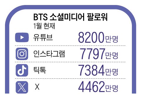 BTS의 파워는 막강한 소셜미디어 ‘연결’에서 나온다. 하이브는 초창기부터 소셜 미디어를 활용하기 위한 독자적 테크 인프라를 개발해 왔다. 팬 플랫폼 ‘위버스’는 전 세계 5000만명(추정)이 사용하는 글로벌 플랫폼으로 성장했고, K컬처를 세계 시장으로 확산시키고 팬들을 시·공간에 구애받지 않고 만날 수 있게 하는 공간으로 자리 잡았다. 소셜미디어를 통한 팬 유입도 이어지고 있다. 공식 계정 기준 BTS 팔로워는 1월 현재 유튜브 8200만명, 인스타그램 7797만명, 틱톡 7384만명, X 4462만명에 달한다.
