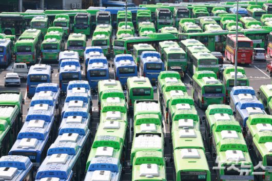 서울 한 버스공영차고지에 서울 시내 버스들이 주차돼 있다. 류영주 기자 |