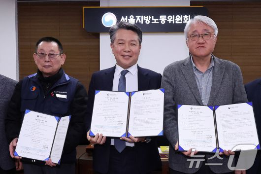 (서울=뉴스1) 박지혜 기자 = 14일 서울 영등포구 서울지방노동위원회에서 열린 특별조정위원회 2차 사후 조정회의에서 서울 시내버스 노사가 임금협상에 극적으로 합의한 뒤 박점곤 서울시버스노동조합 위원장과 김정환 서울시버스사업조합 이사장을 비롯한 참석자들이 기념 촬영을 하고 있다. 2026.1.15/뉴스1