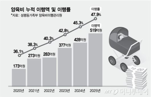 지난해 양육비 이행액은 519억원, 이행률은 47.9%를 기록했다. 1년 전보다 이행액이 21.3% 늘고 이행률도 2.6%포인트(P) 높아졌으나 여전히 이행률이 과반에 못 미쳤다. 지난해 양육비 불이행에 따른 행정제재는 △명단공개 288건 △운전면허정지 1163건 △출국금지 1910건이었다.
