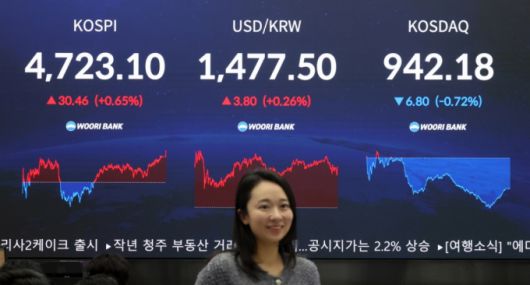 코스피 지수가 사상 처음으로 4700선을 돌파한 14일 오후 서울 중구 우리은행 본점 딜링룸 현황판에 종가가 표시되고 있다. 이날 코스피는 전 거래일 대비 30.46포인트(0.65%)상승한 4,723.10 스닥은 6.80포인트(0.72%) 내린 942.18로 장을 마쳤다. /사진=뉴스1 |
