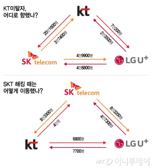 업계 관계자는 "SKT가 해킹사태를 수습하면서 가입자 72만명을 잃었다"며 "아직 56만명 정도 더 데려와야 하는 셈이니 40%대 회복에는 시간이 걸릴 것"이라고 했다.