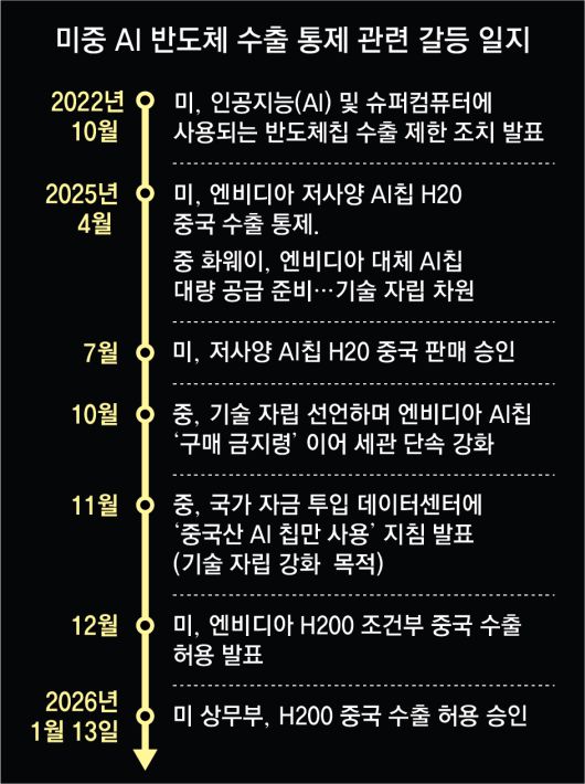 미국과 중국은 지난해 10월 말 경주 아시아태평양경제협력체(APEC) 정상회의를 계기로 부산에서 열린 정상회담 때 무역전쟁의 일시 휴전에 합의했다. 하지만 AI 반도체 등 첨단 기술 분야에서는 주도권을 잡기 위해 치열한 신경전을 이어가고 있다.
