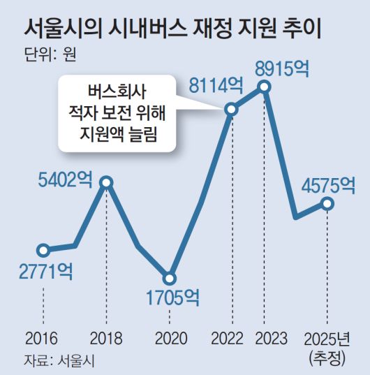 준공영제 도입에 따라 시 예산을 투입하고 있는 서울시도 버스 노사 협상 결과에 촉각을 곤두세우고 있다. 서울시는 2004년 버스 준공영제 도입 후 버스 회사에 환승 할인과 경제성 없는 노선 유지 등의 대가로 보조금을 지원해 오고 있다. 버스 보조금은 2016년 2771억 원에서 지난해 4575억 원(예상치)으로 65.1% 올랐다. 업계 관계자는 “버스 기사 인건비가 높아지면서 서울시의 부담도 커지고 있다”고 했다.