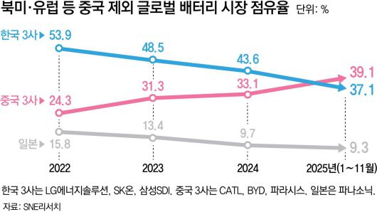 막대한 정부 지원을 등에 업은 중국 업체들의 영향력이 점점 더 커지는 점도 문제다. SNE리서치에 따르면 지난해 1∼11월 기준 국내 배터리 3사(LG에너지솔루션, SK온, 삼성SDI)의 중국 제외 글로벌 시장 점유율은 37.1%로 집계됐다. 2022년 53.9%로 과반을 지켰던 점유율은 2023년 48.5%, 2024년 43.6%로 떨어진 뒤 결국 40% 아래로 내려앉았다.