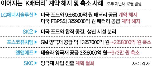 LG에너지솔루션은 지난해 12월 포드(약 9조6000억 원), FBPS(약 3조9000억 원) 등과 맺은 총 13조5000억 원 규모의 배터리 공급 계약이 해지됐다. 엘앤에프는 테슬라와의 약 3조8000억 원 규모 하이니켈 양극재 공급 계약이 978만 원으로 축소됐고, 포스코퓨처엠은 제너럴모터스(GM)와 체결한 양극재 공급 계약 규모를 13조7696억 원에서 2조8111억 원으로 대폭 줄였다.