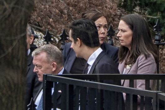 [워싱턴=AP/뉴시스]라스 뢰케 라스무센 덴마크 외교장관(왼쪽)과 비비안 모츠펠트 그린란드 외교장관(왼쪽 세번째)과 대표단이 14일(현지 시간) 미국 워싱턴DC 백악관에서 JD 밴스 부통령, 마코 루비오 국무장관과 회담한 후 떠나고 있다. 2026.01.15. |
