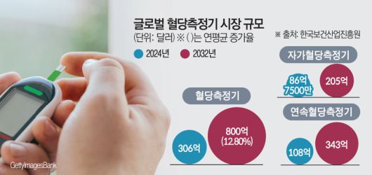 이러한 변화 속에서 혈당측정기 시장도 빠르게 확대되고 있다. 한국보건산업진흥원에 따르면 글로벌 혈당측정기 시장 규모는 2024년 306억 달러(약 45조 원)에서 2032년까지 연평균 12.8% 성장해 약 800억 달러(약 117조 원)에 이를 것으로 전망된다. 같은 기간 자가혈당측정기 시장은 86억7500만 달러(약 12조 원)에서 205억 달러(약 30조 원)로 성장하고 연속혈당측정기 시장은 108억 달러(약 15조 원)에서 343억 달러(약 50조 원)로 더욱 빠른 성장이 예상된다.