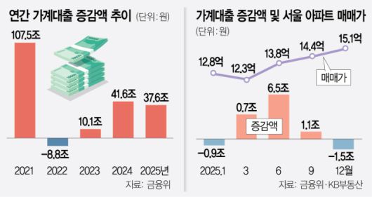 문제는 금융 부문에서 가계대출 억제책이 약발을 발휘하고 있음에도 부동산 가격은 여전히 잡히지 않고 있다는 점이다. 이날 한국은행이 발표한 ‘금융시장 동향’을 보면 지난달 말 은행권 주담대 잔액은 935조 원으로 1개월 전보다 7000억 원 줄어들었다. 2023년 2월 3000억 원이 감소한 후 2년 10개월 만에 처음 내림세를 보인 것이다. 금융위에 따르면 지난해 가계대출은 연간 37조 6000억 원 늘어 전년(41조 6000억 원)에 비해 증가 폭을 줄였다. 국내총생산(GDP) 대비 가계부채 비율도 지난해 9월 말 89.3%에서 12월 말 89.0% 안팎으로 떨어진 것으로 추산된다.