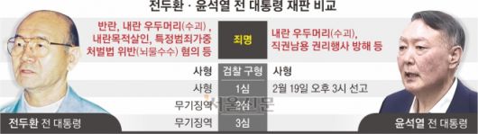 서울중앙지법 형사합의25부(부장 지귀연)는 14일 윤 전 대통령의 재판을 마무리하고 선고 기일을 다음 달 19일 오후 3시로 지정했다. 윤 전 대통령 사건과 관련해 참고할 수 있는 판례는 전두환 전 대통령의 내란 우두머리 등 재판뿐이다. 검찰은 지난 1996년 12·12 군사 반란과 5·18 광주 민주화 항쟁 관련 구속 기소된 전 전 대통령에게 사형을 구형했다. 1심 재판부는 사형을 선고했지만 2심에서 판사의 작량감경(정상참작감경)을 통해 무기징역으로 감형됐고, 이후 대법원에서 확정됐다.