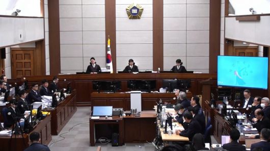 윤석열(맨 오른쪽) 전 대통령이 지난 13일 서울 서초구 서울중앙지법에서 열린 12·3 비상계엄 관련 내란 우두머리 혐의 결심공판에 출석해 있다. 서울중앙지법 제공 영상 캡처 |