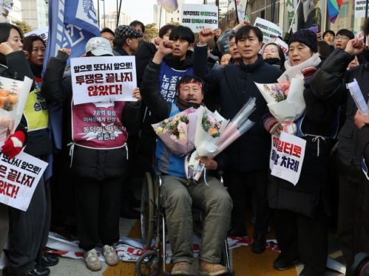 고진수 민주노총 서비스연맹 관광레저산업노조 세종호텔지부장이 14일 서울 중구 세종호텔 앞 구조물에서 내려온 뒤 휠체어에 앉아 구호를 외치고 있다. 연합뉴스 |
