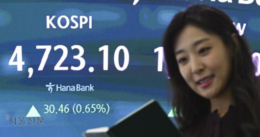 코스피가 14일 사상 처음으로 4700선을 돌파해 장을 마쳤다. 이날 코스피는 전장보다 30.46포인트(0.65%) 오른 4723.10에 거래를 마감했다. 사진은 서울 중구 하나은행 본점 딜링룸에 코스피 지수 주간거래 종가가 표시되고 있는 모습. 이지훈 기자 |