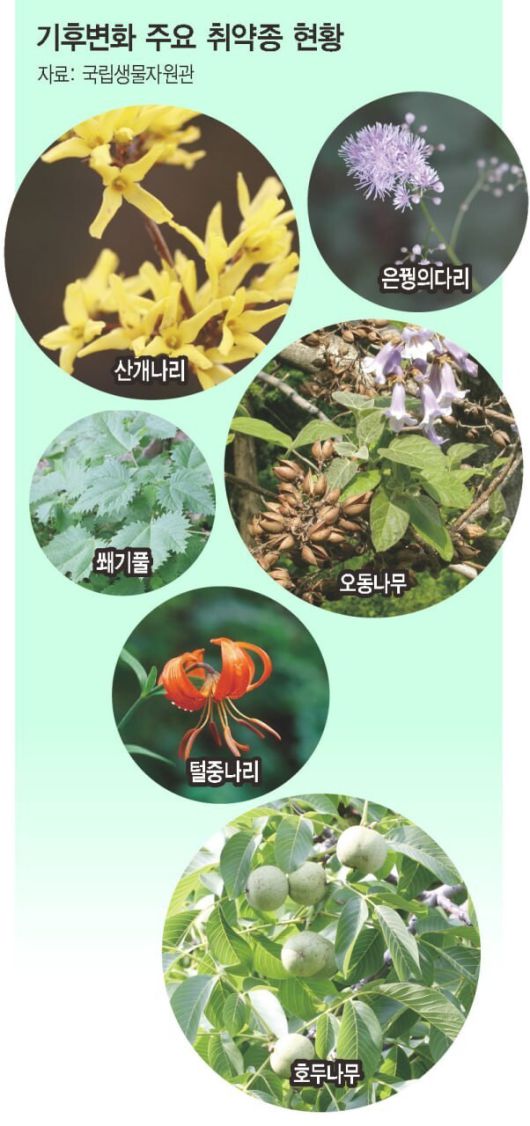 연구진은 또 식물종을 기후변화 취약도에 따라 4~5개 등급으로 분류했는데, 가장 취약한 등급은 모든 기후변화 시나리오에서 절멸이 예측됐다. 이 등급엔 산개나리(서울)와 함께 오동나무(제주도), 은꿩의다리(가거도·여서도), 쐐기풀(서울·제주도), 털중나리(제주도), 호두나무(서울·제주도) 같은 식물이 속했다. 이 중 산개나리, 오동나무, 은꿩의다리, 털중나리 같은 식물은 한반도 고유종이다. 기후변화가 이대로 진행되면 세기말 한반도엔 개나리, 개망초, 코스모스, 무궁화, 민들레 같은, 기후변화를 버텨내는 튼튼한 1등급 종들만 남는다. 취약종에 대한 보호대책이 필요한 것이다.