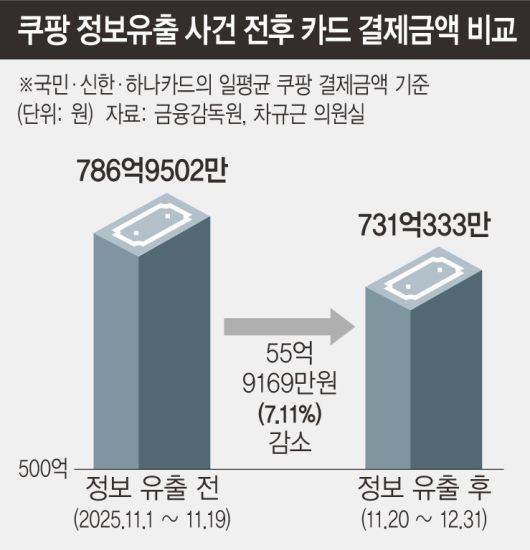 14일 국회 재정경제기획위원회 소속 차규근 의원실(조국혁신당)이 금융감독원을 통해 제출받은 국민·신한·하나카드의 쿠팡 결제 내역을 분석한 결과를 보면, 지난해 11월20일부터 12월31일까지 쿠팡의 하루 평균 결제 금액은 731억333만원으로 집계됐다. 개인정보 유출 사실이 공개되기 직전 11월 1∼19일 하루 평균 결제금액인 786억9502만원에 견주면 7.11% 감소한 수치다. 이 기간에 매일 약 56억원의 카드 매출이 증발한 셈이다. 같은 기간 하루 평균 결제 건수 역시 252만5069건에서 234만6485건으로 7.07% 줄었다.