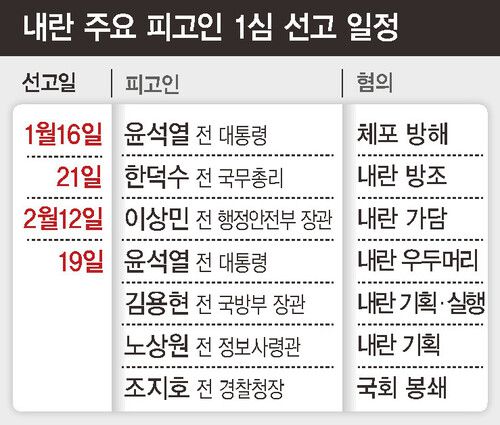 12·3 비상계엄에 가담한 이들을 내란죄로 처벌이 가능한지 가늠할 수 있는 첫 판단은 오는 21일 예정된 한덕수 전 국무총리의 1심 선고(형사33부, 재판장 이진관)에서 나온다. 한 전 총리는 내란 우두머리 방조 등 혐의로 기소됐는데, 유죄가 선고되면 계엄의 법적 성격을 내란으로 공인하는 첫 판결이 된다. 내란 주요 피고인들 사건에도 가이드라인이 될 전망이어서, 언론사 단전·단수 지시 혐의(내란 중요임무 종사)로 기소돼 오는 2월12일 1심 선고가 나오는 이상민 전 행정안전부 장관 사건(형사32부, 재판장 류경진)에도 영향을 미칠 것으로 보인다. 한 전 총리와 이 전 장관에게는 각각 징역 15년이 구형됐다.