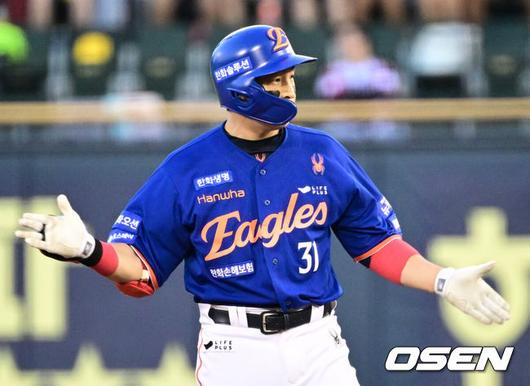 [OSEN=잠실, 조은정 기자]10일 오후 서울 잠실구장에서 ‘2025 신한 SOL Bank KBO리그’ LG 트윈스와 한화 이글스의 경기가 열렸다.LG는 손주영, 한화는 문동주를 선발로 내세웠다.5회초 1사 2루 한화 손아섭이 1타점 2루타를 날린 뒤 세리머니를 하고 있다.2025.08.10 /cej@osen.co.kr |