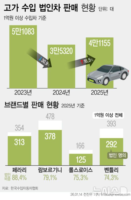 15일 한국수입자동차협회(KAIDA)에 따르면 지난해 판매된 1억원 이상 수입차 가운데 법인 명의 차량은 4만1155대로, 전년 대비 16.5% 증가했다.