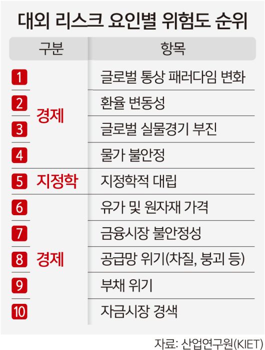 세부 요인별로도 위험도 상위 10개 중 9개가 경제 리스크로 조사되며, 경제 부문에 위험 인식이 집중됐다. 특히 ‘글로벌 통상 패러다임 변화’가 가장 큰 위험 요인으로 꼽혔다. 보호무역 강화와 무역장벽 확대 등 통상 환경 변화가 수출과 산업 전반에 구조적인 부담으로 작용할 수 있다는 우려가 반영됐다. 이어 환율 변동성, 물가 불안정, 금융시장 불안정성 등에 대한 경계도 높게 나타났다. 산업연구원은 경제 리스크가 실물·금융 부문 전반에 영향을 미치고, 부문 간 연계성을 통해 충격이 빠르게 퍼질 수 있다고 분석했다. 지정학·기술 리스크 역시 단독 요인이라기보다 경제 리스크와 맞물려 복합적인 영향을 미칠 가능성이 크다는 평가다.