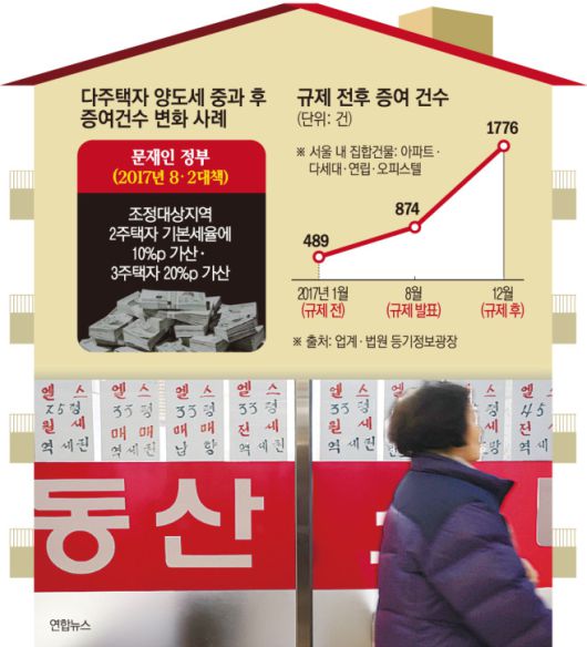 시장에는 정책 시행 직전 매물이 쏟아졌다. 한국부동산원 통계를 보면 2018년 1~3월 서울 아파트 거래량은 3만6533건으로 전년 동기(1만6189건)와 비교해 약 2.3배 급증했다. 중과 시행 직전 ‘막차 거래’가 몰린 셈이다.