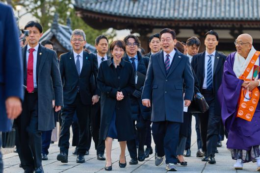 이재명 대통령이 14일(현지 시간) 다카이치 사나에 일본 총리과 함께 나라현의 대표 문화유적지인 호류지를 둘러보고 있다. 뉴시스 |