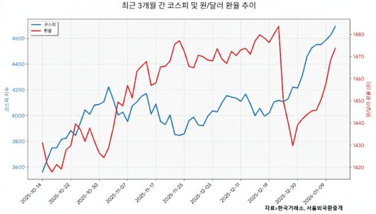 새해 첫 거래일인 1월 2일 4309.63으로 출발한 코스피 지수는 13일 4692.64를 기록한 데 이어 14일 4723.10으로 마감하며 또 한 번 사상 최고치를 경신했다. 불과 9거래일 만에 지수가 약 413.47포인트(9.59%) 급등하며 기록적인 랠리를 보이고 있다. 환율 역시 가파른 수직 상승세를 보이고 있다. 지난해 연말 1420원대까지 낮아졌던 환율은 보름여 만에 50원 가까이 상승해 13일 1478.50원까지 치솟았다가 14일 1477.50원으로 소폭 하락하며 숨 고르기에 들어갔다.