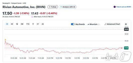 14일(현지 시각) 뉴욕증시에서 리비안은 7.16% 급락한 17.50달러를 기록했다.