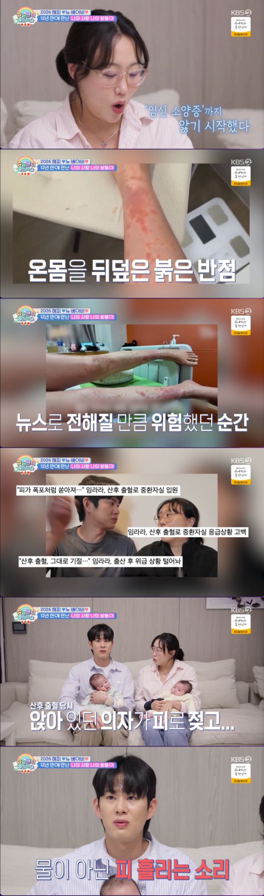 무엇보다 임라라를 힘들게 했던 것은 ‘임신 소양증’이었다. 온몸을 뒤덮은 붉은 반점 때문에 고통스러웠지만, 배 속의 아이들을 위해 약조차 쓸 수 없었던 상황. 그녀는 면역력이 완전히 바닥난 상태에서 출산을 맞이해야 했고, 이는 결국 산후 과다출혈이라는 비극으로 이어졌다.