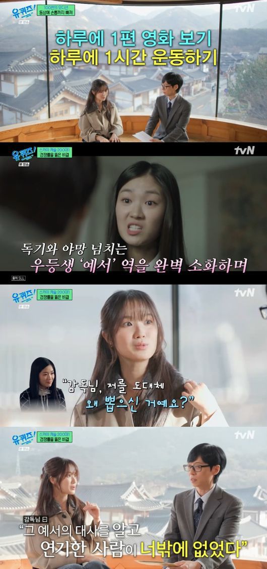 그러자 유재석은 “이 길이 내 길이 맞나 고민했을 것 같다”라고 물었다. 김혜윤은 “단역, 보조 출연을 정말 오래 하다 보니까 ‘내가 연기를 잘하고 있나?’ ‘내 직업이 맞나?’ 이런 생각들을 많이 했다. 그럴때 마다 하루에 1편 영화보고, 1시간 운동했다. 저만의 규칙을 만들지 않으면 이 길이 너무 멀고 막막한 것 같더라”라고 털어놨다.