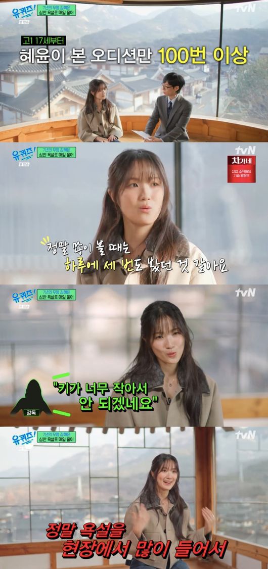이날 김혜윤은 오디션만 100번 이상 봤다며 “정말 많이 볼 때는 하루에 세 번도 봤다”라며 “‘오늘도 떨어지러 가는구나’ 이렇게 생각하면서 항상 갔다”라며 “항상 오디션 볼 때마다 ‘키가 너무 작아서 안되겠다’ 그런 콤플렉스가 있었다”라고 밝혔다.