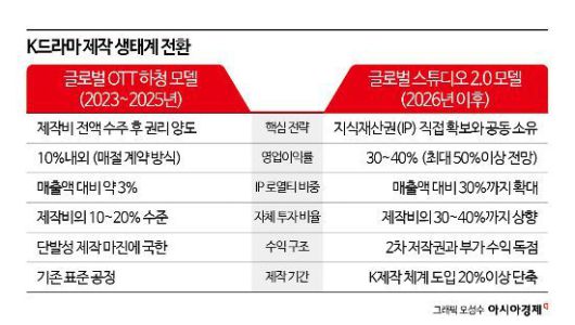 특히 올해는 넷플릭스가 2023년 약속한 25억달러(약 3조6000억원) 투자 계획이 종료되는 시점이다. 업계는 이를 제작 생태계의 명운을 가를 분기점으로 본다. 넷플릭스의 투자는 작품 품질을 끌어올린 반면 제작사를 단순 납품업체로 전락시켰다는 비판도 받는다. 이에 CJ ENM, SLL, 카카오엔터테인먼트 등은 완성작 판매 중심에서 벗어나 한국형 기획·제작 시스템을 해외에 심는 '글로벌 스튜디오' 모델로 전환하고 있다.