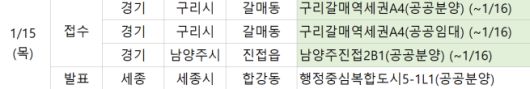 부동산 정보업체 부동산R114에 따르면 15일 오늘은 경기 구리시 ‘구리갈매역세권A4’ 공공분양 및 공공임대 단지와 남양주시 ‘남양주진접2B1(공공분양)’에서 청약 접수가 진행된다. 해당 단지들은 16일까지 접수를 받는다.