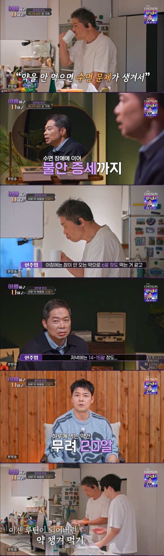 신체적 변화보다 더 심각한 것은 그의 심리적 상태였다. 현주엽은 현재 극심한 불안 증세와 수면 장애를 겪고 있다며 “약을 안 먹으면 수면 문제가 생겨 잠을 못 잔다. 아침에는 잠이 안 오는 약을 6알 정도 먹고, 저녁에는 안정제와 수면제를 포함해 14~15알 정도를 먹는다”고 말해, 하루 21알의 약에 의존해 버티고 있는 처절한 근황을 전했다.