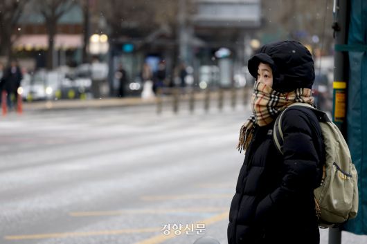 서울에 눈이 내린 12일 서울 종로구 광화문네거리에서 시민들이 횡단보도를 건너고 있다. 문재원 기자 |