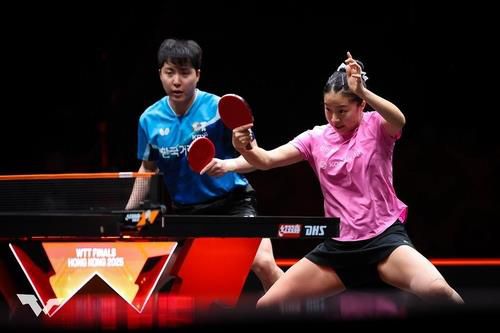 WTT 파이널스 홍콩 혼합복식에 나선 신유빈(오른쪽)과 임종훈 |