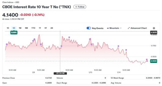 미 국채 10년물 금리 차트, 자료=야후 파이낸스, 2026.01.15 koinwon@newspim.com |