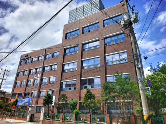 붉은 벽돌로 지어진 YDP 미래평생학습관 건물의 전경 사진이다.건물 뒤로 높은 건물이 보이고, 하늘에는 구름이 조금 있는 모습이다. |