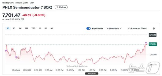 14일(현지 시각) 뉴욕증시에서 반도체지수는 0.60% 하락한 7701.47포인트를 기록했다.