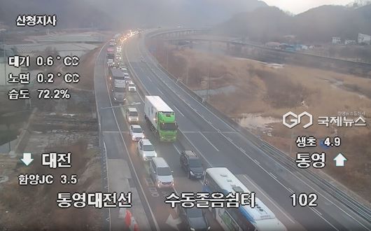 한국도로공사에 따르면 15일 오전 7시 32분경 통영대전고속도로 대전방향 102km 지점(수동졸음쉼터 인근)에서 사고가 발생했다. 이 사고로 현재 대전방향 일방향 차로가 모두 차단되어 차량 통행이 불가능한 상태다.