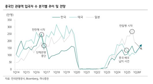 중국과 일본 간 관계 변화에 따른 반사 수혜도 주요 투자 포인트로 꼽았다. 하나증권은 과거 사드(THAAD) 사태 당시 중국 관광객 감소 이후 일본과 태국으로 수요가 이동했던 사례를 언급하며, 최근 중국의 일본향 노선 축소와 비자 발급 제한 움직임이 한국 인바운드 관광에 긍정적으로 작용할 가능성이 크다고 분석했다. 이에 따라 2027년 방한 관광객 수는 2350만 명, 이 가운데 중국인 관광객은 800만 명 수준으로 2016년 고점을 회복할 것으로 내다봤다.