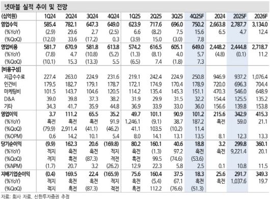 강석오 신한투자증권 연구원은 “4Q25(2025년 4분기) 영업수익 7502억원(전년 동기 대비 + 15.6%), 영업이익 1012억원(+187.2%)을 기록하며 컨센서스 영업이익 1058억원에 부합할 전망”이라며 “대형 기대작 ‘일곱개의대죄:오리진’과 ‘몬길:스타다이브’의 출시가 지연됐지만 ‘뱀피르’와 ‘세븐나이츠리버스’가 예상을 상회하는 매출 지속성을 보였다”고 설명했다.