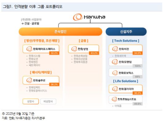 분할 후 존속회사(한화)는 방산·우주항공, 조선·해양, 에너지·케미칼, 금융 중심으로 재편된다. 세부적으로는 방산·우주항공에 한화에어로스페이스·한화시스템·쎄트렉아이, 조선·해양에 한화오션·한화엔진, 에너지·케미칼에 한화솔루션·한화임팩트·한화토탈에너지스, 금융에 한화생명·한화손해보험·한화자산운용·한화투자증권 등이 포함된다.