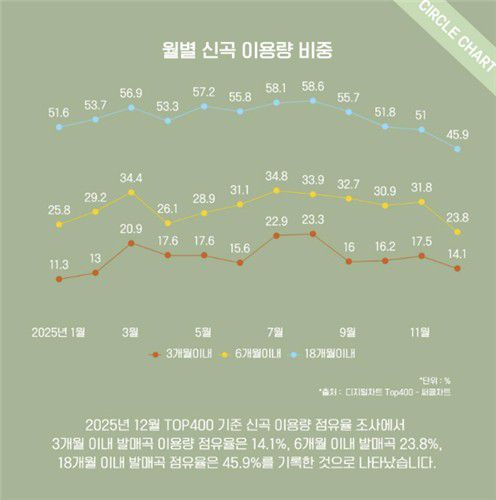 발매 18개월 이내 신곡 점유율은 지난해 8월 연중 가장 높은 58.6%를 기록한 뒤 9월 55.7%, 11월 51%로 점차 하락했다.