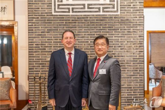 박관천 대통령경호처 정책관(오른쪽)과 제임스 R. 헬러 주한미국대사관 대사대리가 지난 12일 미국대사관저에서 열린 대통령경호처 초청 리셉션에서 기념촬영을 하고 있다. (대통령경호처 제공. 재판매 및 DB 금지) 2026.01. 15/뉴스1 ⓒ News1 한병찬 기자 |