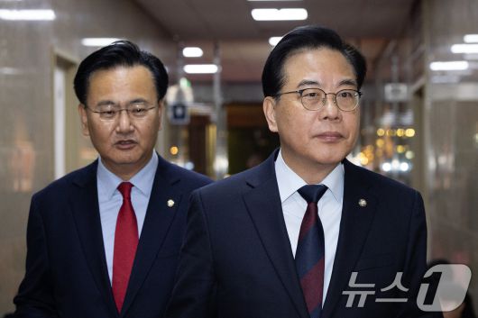 (서울=뉴스1) 유승관 기자 = 송언석 국민의힘 원내대표(오른쪽)와 유상범 원내운영수석부대표가 15일 서울 여의도 국회에서 열린 우원식 국회의장 주재 여야 원내대표 회동을 위해 의장 집무실로 들어서고 있다. 2026.1.15/뉴스1