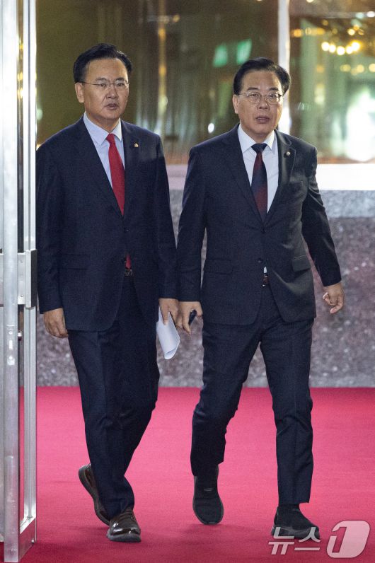 (서울=뉴스1) 유승관 기자 = 송언석 국민의힘 원내대표(오른쪽)와 유상범 원내운영수석부대표가 15일 서울 여의도 국회에서 열린 우원식 국회의장 주재 여야 원내대표 회동을 위해 의장 집무실로 들어서고 있다. 2026.1.15/뉴스1fotogyoo@news1.krCopyright ⓒ 뉴스1. All rights reserved. 무단 전재 및 재배포, AI학습 이용 금지.