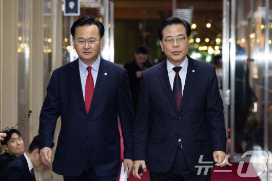 (서울=뉴스1) 유승관 기자 = 송언석 국민의힘 원내대표(오른쪽)와 유상범 원내운영수석부대표가 15일 서울 여의도 국회에서 열린 우원식 국회의장 주재 여야 원내대표 회동을 위해 의장 집무실로 들어서고 있다. 2026.1.15/뉴스1fotogyoo@news1.krCopyright ⓒ 뉴스1. All rights reserved. 무단 전재 및 재배포, AI학습 이용 금지.